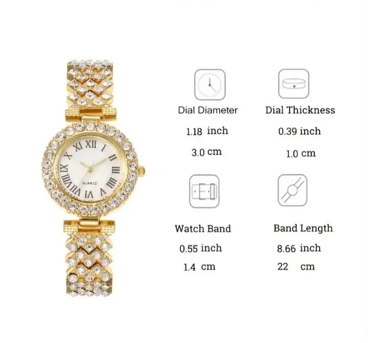 ساعة كوارتز للنساء مع 4 قطع إكسسوارات ، ، ويأتي المنتج في بوكس هدية من متجرنا فكرة ترند. كما أن المنتج فخم وتصميم أنيق يليق بك سيدتي لتكوني الأجمل ولتكوني متألقة دائمًا، كذلك فإن الطقم يأتي ب 3 ألوان فضي وذهبي أصفر وذهبي وردي، وأمامك الاختيار لتختاري لونك المفضل، الطقم كله مزين بأحجار الزركون الماسية التي تجذب العقل والقلب.